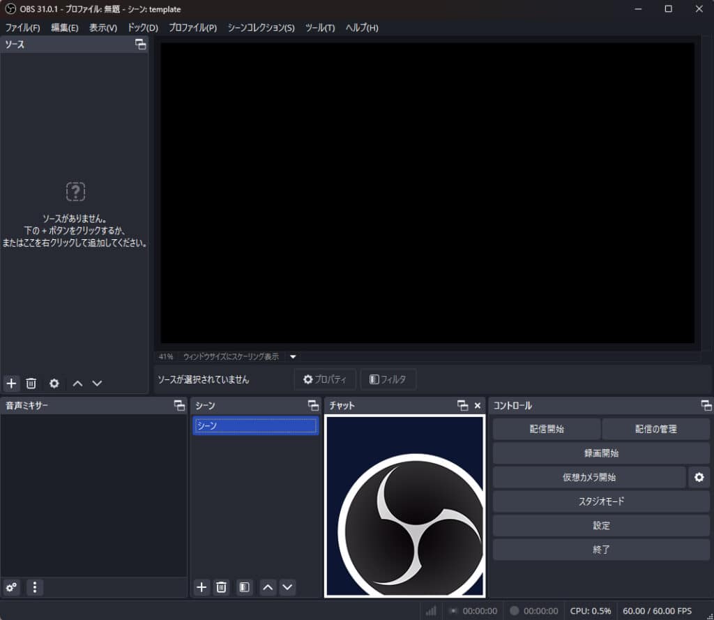 OBSを開いて、左上の「ファイル」をクリックします。