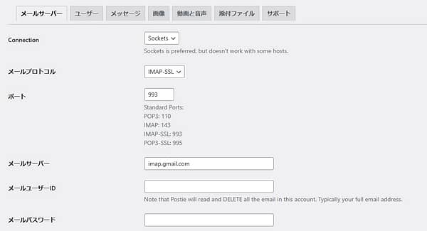 - 「メールでの投稿」の4つの項目を以下の通り入力