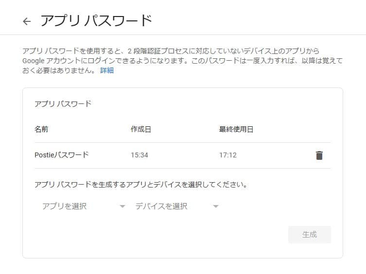 - 「アプリの選択」をメールにし、「デバイスの選択」を「その他(名前を入力)」にし、「Postieパスワード」(任意の文字列)を入力する