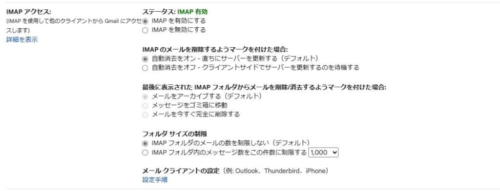 - 「IMAPアクセス」で「IMAPを有効にする」をチェックし、変更を保存